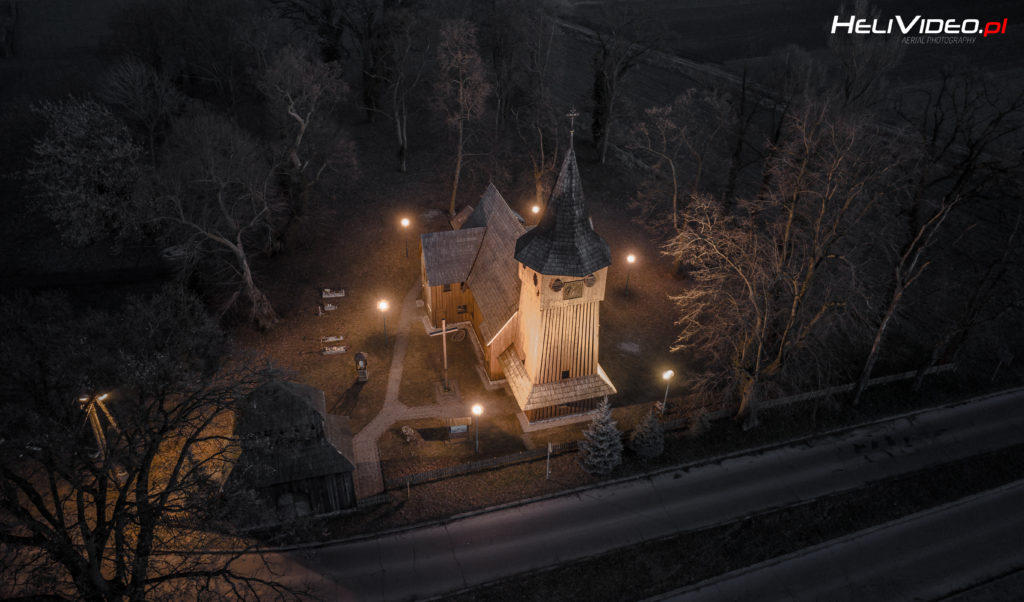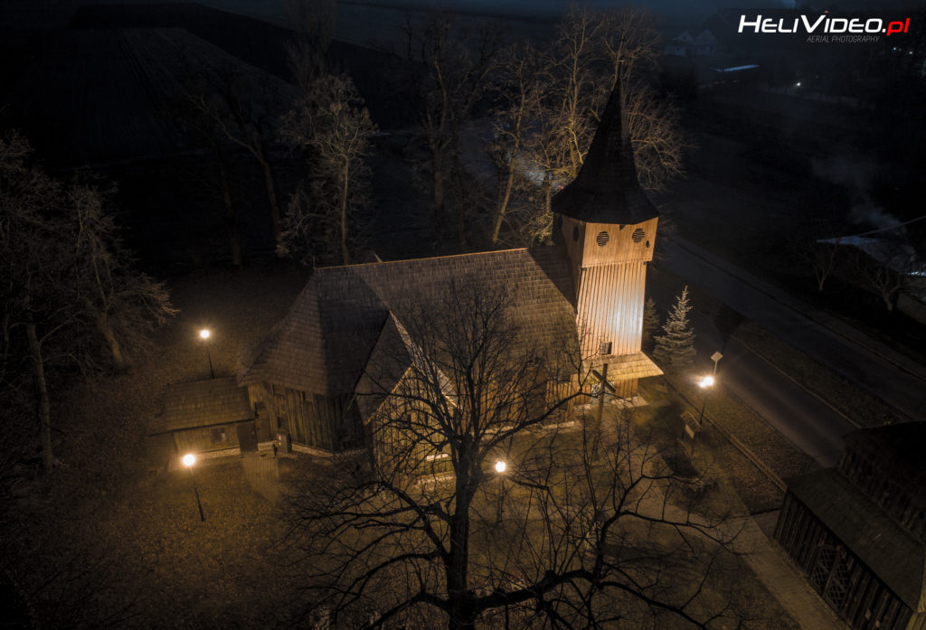 Magiczny zabytkowy drewniany Kościół z lotu ptaka.